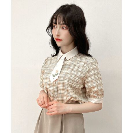 【洗える】マーガレット刺繍タイ付きチェックシャツ