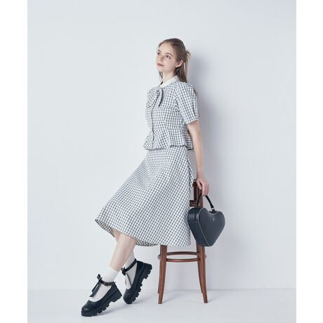 お揃いの生地でお作りしたドビーチェックフレアースカートとセットアップで着用するのがオススメです!
