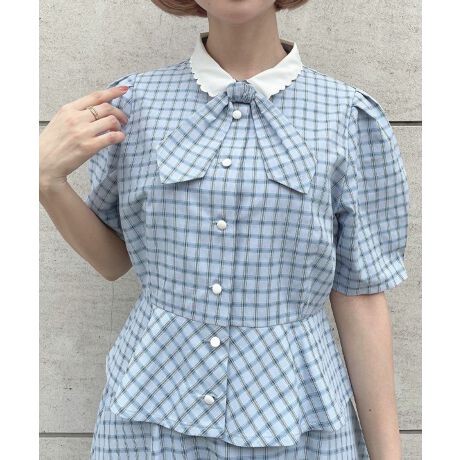 【セットアップ可能】【洗える】クレリック衿 ドビー チェック ペプラム ブラウス