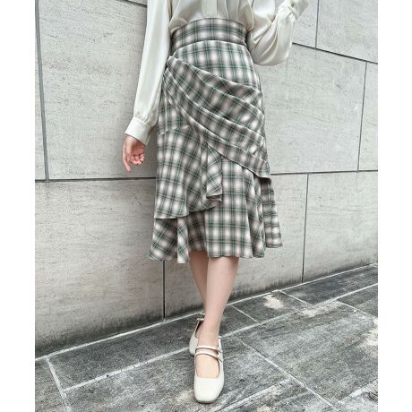 幼い印象になりがちなカラーチェックも、ラッフル使いとひざ下丈のレディライクな雰囲気で、新鮮なデザインに落とし込みました。