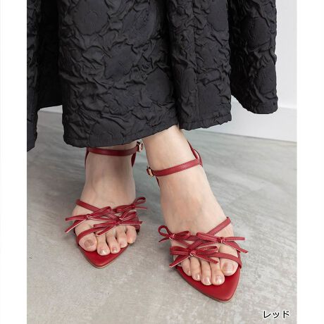 華奢なストラップとランダムに並んだリボンがキャッチーな一足。
