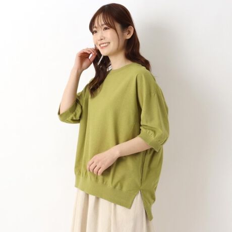 さらっとした柔らかな綿麻レーヨン生地を使用。ネックと袖と裾のリブでカジュアル感をプラス。