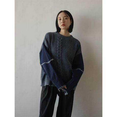 肉感のあるケーブルニット生地に、デニム生地をドッキングしたデザインが魅力の一枚。