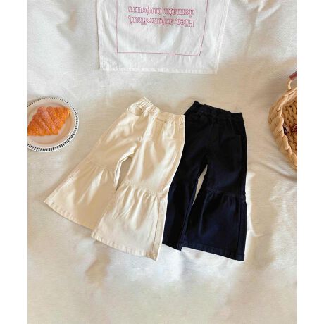 フレアデザインが特徴のキッズパンツ。動きやすく履き心地抜群。ウエストはゴム仕様で、簡単に着脱でき、日常的に活躍するアイテムです。
