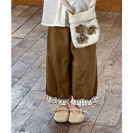 裾部分に施されたレースが特徴のキッズパンツ。ナチュラルな色合いとシンプルなデザインで、どんなトップスにも合わせやすい一枚です。ウエスト部分はゴム仕様で、着脱が簡単。ほどよい丈感が可愛らしさと実用性を兼ね備えています。