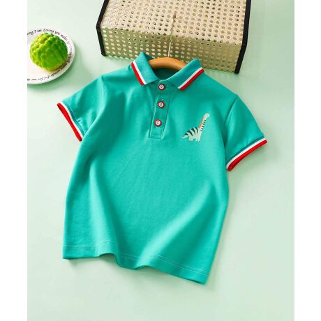カラフルなラインの入った襟と袖口が目を惹くキッズポロシャツ。胸元には可愛らしい刺繍が施され、遊び心のあるデザインに仕上げています。ボタンの縁は赤色で、元気で明るい印象をプラス。爽やかな4色展開(グリーン、イエロー、ブルー、ホワイト)で、日常使いにぴったりのアイテムです。