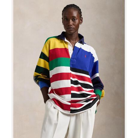 トラディショナルなラガーシャツの特徴をデザインにすべて詰め込み、コットンジャージーでオーバーサイズのチュニック風シルエットに仕立てたバージョン。大胆なストライプパターンの組み合わせが特徴的なパッチワーク風モチーフを採用し、胸元にシグネチャーのポニー刺繍をあしらったアイテム。・わずかにオーバーサイズのフィット / 腰丈・ツイルのラグビーカラー / 2つボタンの前立て / ラバーボタン・長袖、リブカフス / ドロップショルダー / ストレートなスリット入りの裾・左胸にシグネチャーのポニー刺繍・Ralph Laurenのコットン製品を選ぶことで、環境の保護と修復に努めながら、コットン業界が今後も成長を続けられるように支援するBetter Cotton(TM)ミッションへのRalph Laurenの取り組みをサポートすることになります・本商品は物質収支方式に則って材料を調達しているため、全ての製品にBetter Cotton(TM)が含まれない可能性があります。・モデル身長178cm、着用サイズS※商品の色味は、光のあたり具合など諸条件により色感が多少異なって見える場合がございますので予めご了承下さい。※注意:柄の配置は、商品によって異なります。 【素材】・本体:綿 100% 装飾部分を除く【生産国】マカオ