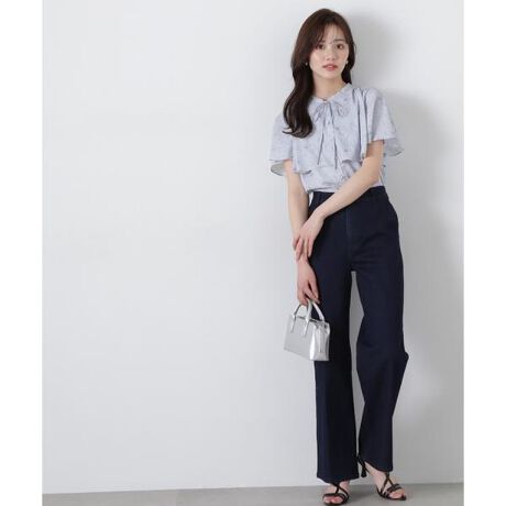 ライトオンスの軽いデニム素材を使用したスラックスパンツ。微ストレッチ素材なので脚のラインをキレイに見せてくれます。ウエスト位置は少し低く設定。ニットやブラウス、Tシャツとも合わせやすく、きれいめカジュアルスタイルが完成します。