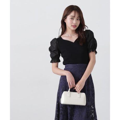 シアースリーブを組み合わせた異素材コンビニットです。ギャザースリーブにシャーリングを入れた、パフ袖がポイント。スクエアのハートカットで、デコルテをキレイに見せながら顔まわりをすっきりを演出してくれます。