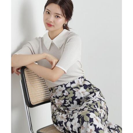 秋冬に人気だったアイテムがさらっとした素材を使い半袖になって登場!襟を取り外すとバイカラーのトップスになる2wayデザインのリブニットです。襟につけたパール調が上品さをプラス。シルエットがきれいに見えるリブ編みにし、襟はシャツ地でキレイ目に仕上げています。