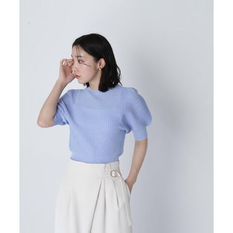 ワッフルのような柄編みがポイントのニットプルオーバー。クルーネックの襟ぐりに対して、袖はタックを入れたボリューム感のあるパフスリーブが愛らしいデザイン。短丈シルエットなのでハイウエストボトムと相性が良く、キレイめやシンプルパンツはもちろん、デニムと合わせてカジュアルダウンするなど、着回しを楽しめます。<素材>クリアなタッチの糸を、ポコポコとした表面感のある柄編みで編み立てました。<詳細>仕様・開閉なし裏地・なし透け感・なし / 光沢・なし / 伸縮性・あり 生地の厚さ・普通※モデルの着用画像の場合、光の当たり具合により、実際の色味と異なって見えることがございます。色味は、商品単体の画像をご参照ください。