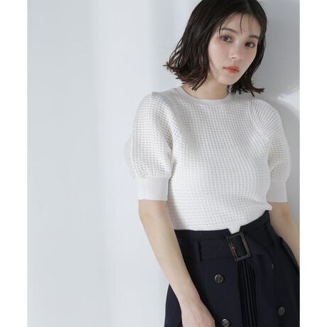ワッフルのような柄編みがポイントのニットプルオーバー。クルーネックの襟ぐりに対して、袖はタックを入れたボリューム感のあるパフスリーブが愛らしいデザイン。短丈シルエットなのでハイウエストボトムと相性が良く、キレイめやシンプルパンツはもちろん、デニムと合わせてカジュアルダウンするなど、着回しを楽しめます。<素材>クリアなタッチの糸を、ポコポコとした表面感のある柄編みで編み立てました。<詳細>仕様・開閉なし裏地・なし透け感・なし / 光沢・なし / 伸縮性・あり 生地の厚さ・普通※モデルの着用画像の場合、光の当たり具合により、実際の色味と異なって見えることがございます。色味は、商品単体の画像をご参照ください。