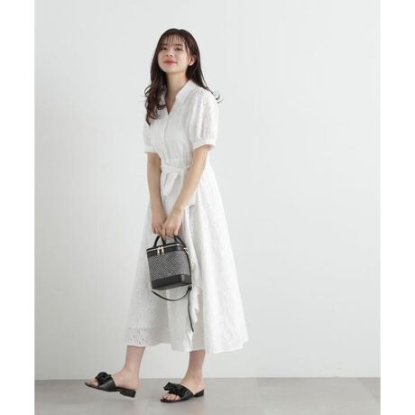 カットワーク刺しゅうを施した大人フェミニンなシャツワンピース。スカート部分のラッフルディテールがポイントです。袖は裏地をなくして軽やかさをプラス。付属のリボンベルトでウエストマークするとメリハリのあるシルエットを演出します。