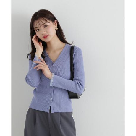 袖口のシアーフリルが愛らしいポイントのリブカーディガン。ボタンを留めてVネックプルオーバー風に着こなすのがオススメです。オンもオフスタイルにも合わせやすく、様々なシーンに着用いただけます。