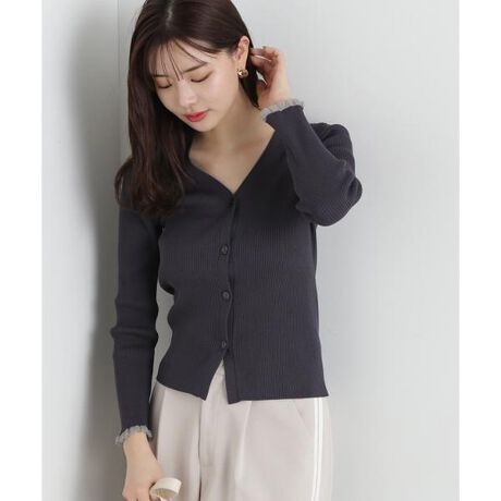 袖口のシアーフリルが愛らしいポイントのリブカーディガン。ボタンを留めてVネックプルオーバー風に着こなすのがオススメです。オンもオフスタイルにも合わせやすく、様々なシーンに着用いただけます。