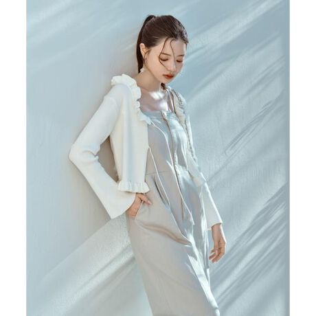 トレンドのラッフルデザインのリブニットカーディガン。袖はフレンチスリーブで、フロントのWリボンもアクセント。インナーにはキャミソールやタンクトップ、レーストップスと合わせるコーディネートがお勧めです。<素材>ラメ入りの糸を使用しています。<詳細>仕様・前リボン裏地・なし透け感・なし / 光沢・ややあり / 伸縮性・あり 生地の厚さ・普通※モデルの着用画像の場合、光の当たり具合により、実際の色味と異なって見えることがございます。色味は、商品単体の画像をご参照ください。●こちらの商品はofficial site・新宿ルミネエスト・名古屋パルコ・京都ポルタ・天神地下街限定販売となります。