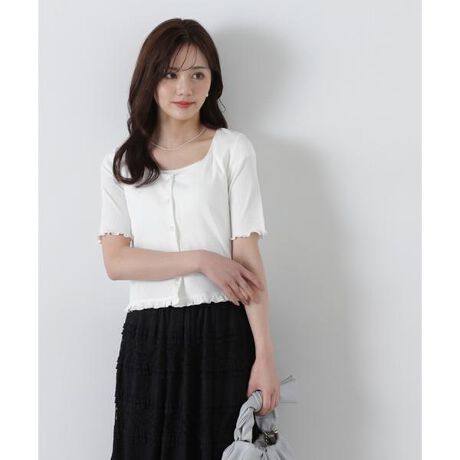 カットソー素材のカーディガンとインナーのアンサンブルです。カーディガンはピコレースとフリルをポイントにしつつ、甘くなりすぎないデザイン。インナーはデコルテがキレイに見えるキャップスリーブなので、他のアイテムとも着回せます。幼くなりすぎない短丈デザインの2点セットです。