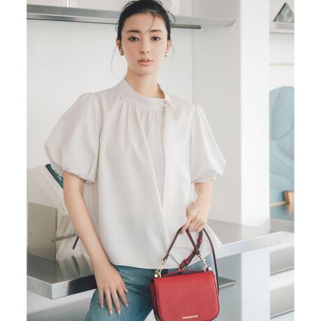 NBBで昨年大人気だったデザインブラウスが、リネンライク素材にアップデート!スタンドネックから繋がる長めのサイドタイがエレガントな印象の着映えブラウスです。襟ぐりのメタル釦とボリュームのあるバルーンスリーブで、華やかさをプラス。ハンサムもフェミニンな着こなしも楽しめるデザインです。キレイめスカートやパンツ合わせで通勤シーンはもちろん、今年はデニムパンツ合わせでカジュアルダウンするのもおすすめです。<素材>涼しげなリネンライク素材でナチュラルなメランジ見えが特徴。程よくハリがありキレイなフォルムが出ます。<詳細>仕様・前ボタン※モデルの着用画像の場合、光の当たり具合により、実際の色味と異なって見えることがございます。色味は、商品単体の画像をご参照ください。