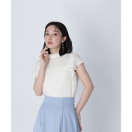 身頃にクリスタルプリーツをあしらった楊柳素材のブラウス。スタンドネックのフリルカラーが、顔まわりを華やかな印象に見せてくれます。袖はフリルスリーブで、二の腕ラインをカバーしながら華奢見えに。トップスインでもアウトでも着やすい丈感に拘ったデザインです。プリーツの身頃にフリルディテールを加える事で、より華やかな印象を演出します。<素材>縦目に表情のある、軽く柔らかい風合いの楊柳素材を使用。身頃はクリスタルプリーツを施しています。裏地には軽やかなシフォン素材を使用しています。<詳細>仕様・後ろボタン裏地・あり透け感・ややあり / 光沢・なし / 伸縮性・ややあり 生地の厚さ・薄手※モデルの着用画像の場合、光の当たり具合により、実際の色味と異なって見えることがございます。色味は、商品単体の画像をご参照ください。