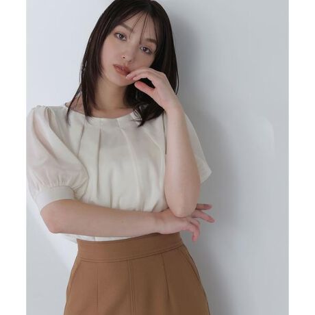 首元がすっきりとしたシアー感のある夏らしいブラウス。首元にタックを入れているので、ウエストをインして着た時もふんわりとしたシルエットをキープします。膨らみのあるふんわりとした袖のボリュームで、メリハリのあるシルエットに。身頃は裏地が付いているのでインナーを気にしないで着ていただけます。<素材>ふんわりとしたハリのあるシアー素材を使用しています。<詳細>仕様・後ろボタン裏地・あり透け感・あり / 光沢・なし / 伸縮性・なし 生地の厚さ・薄手※モデルの着用画像の場合、光の当たり具合により、実際の色味と異なって見えることがございます。色味は、商品単体の画像をご参照ください。