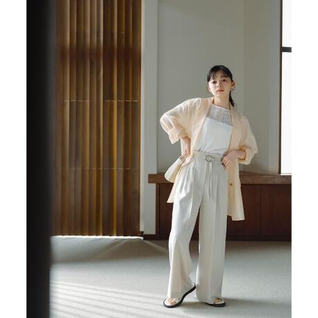 ニュアンスカーブが効いたメタルバックルが付いている、共糸ダブルベルトがポイントのワイドパンツ。共糸ベルトはきゅっと一つ結びにして、ベルト先を垂らすのがおすすめです。後ろウエストはゴム仕様でストレスフリーなはき心地。センタープレスが入っているタックワイドシルエットで、スタイルアップ効果を期待できます。裏地がなくても透け感が気になりにくい肉感のため、汗ばむ時期も軽やかに着ていただけます。<素材>さらっとしたタッチの合繊ツイル素材を使用。シワになりにくい素材感です。<詳細>仕様・前ファスナー※モデルの着用画像の場合、光の当たり具合により、実際の色味と異なって見えることがございます。色味は、商品単体の画像をご参照ください。
