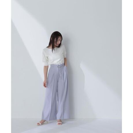 ニュアンスカーブが効いたメタルバックルが付いている、共糸ダブルベルトがポイントのワイドパンツ。共糸ベルトはきゅっと一つ結びにして、ベルト先を垂らすのがおすすめです。後ろウエストはゴム仕様でストレスフリーなはき心地。センタープレスが入っているタックワイドシルエットで、スタイルアップ効果を期待できます。裏地がなくても透け感が気になりにくい肉感のため、汗ばむ時期も軽やかに着ていただけます。<素材>さらっとしたタッチの合繊ツイル素材を使用。シワになりにくい素材感です。<詳細>仕様・前ファスナー※モデルの着用画像の場合、光の当たり具合により、実際の色味と異なって見えることがございます。色味は、商品単体の画像をご参照ください。