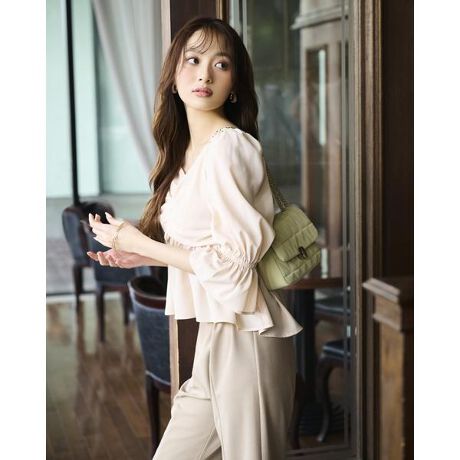 フロントギャザーが愛らしく映えるペプラムブラウス。肩はゴムが入っているので、オフショルダーとしても着こなせます。背中はシャーリングゴム仕様で着心地良くフィット。裾は前から後ろにかけて長さを出したフィッシュテールのペプラムデザインです。