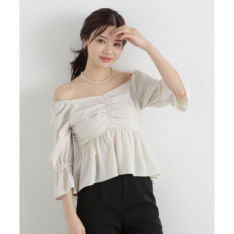フロントギャザーが愛らしく映えるペプラムブラウス。肩はゴムが入っているので、オフショルダーとしても着こなせます。背中はシャーリングゴム仕様で着心地良くフィット。裾は前から後ろにかけて長さを出したフィッシュテールのペプラムデザインです。