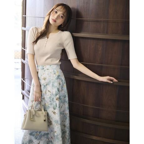 パフスリーブ&ヘンリーネックの組み合わせが愛らしいリブニット。フロントに付けた小さいメタル釦がポイントです。襟ぐりが大きめに開いているのでキレイに着こなせるデザインです。