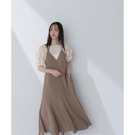 襟がすっきりとしたVネックデザインのキャミワンピース。ウエストはすっきりとしたボディ感で、裾にはふんだんにマチを入れているので、動くたびにふわっと揺れるシルエットを演出。バックスタイルもVネックで抜け感を出しながら、肩紐を二重に繋げたデザインで、華奢見え効果も期待できます。コンパクトなニットやボウタイブラウスなど、合わせるインナーを選ばずに着ていただけます。便利なスラッシュポケット付き。<素材>さらりとしたタッチでシワになりにくい合繊素材を使用。軽やかな着心地です。裏地がなくても透け感を気にしないで着られる素材です。<詳細>仕様・後ろファスナー裏地・なし透け感・なし / 光沢・なし / 伸縮性・ややあり 生地の厚さ・普通※モデルの着用画像の場合、光の当たり具合により、実際の色味と異なって見えることがございます。色味は、商品単体の画像をご参照ください。