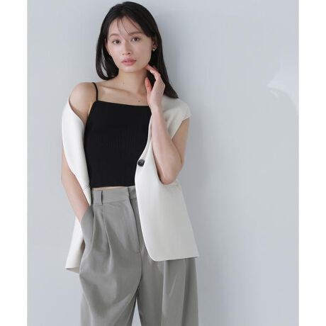 シアーなジャケット、シャツ、トップスのインナーに便利なニットキャミビスチェ。胸元が真っすぐなラインのため、Vネックアイテムのレイヤードも決まりやすく、華奢な肩紐は見えても様になる安心のデザイン。裾をインしなくても着られるクロップド丈は、ハイウエストボトムと相性バツグンで、ウエストまわりがキレイに見えて夏も涼しく着ていただけます。<素材>シャリ味のあるドライタッチな素材で肌当たりも涼しく、夏のインナーにオススメな素材。細いリブ編みで体にキレイにフィットします。<詳細>仕様・開閉なし裏地・なし透け感・なし / 光沢・なし / 伸縮性・あり 生地の厚さ・普通※モデルの着用画像の場合、光の当たり具合により、実際の色味と異なって見えることがございます。色味は、商品単体の画像をご参照ください。