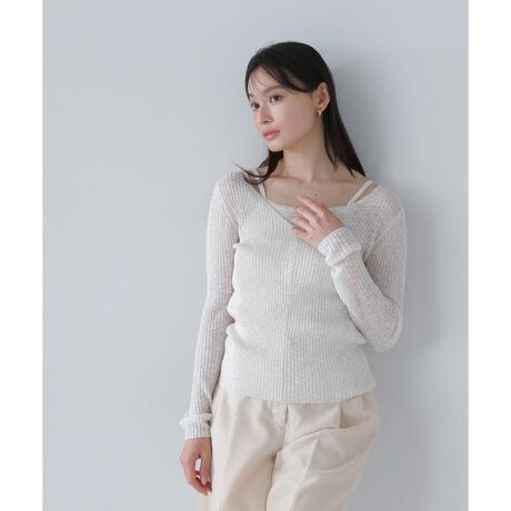 メランジ調の糸を使用した抜け感のあるセットアイテムです。キャミソールはアメスリのようなデザインなので、アンサンブルで着ると自然に肩の部分でさりげない肌見せスタイルが完成。伸縮性のあるリブ編みが女性らしい体のラインを演出します。Vネックニットはデコルテをキレイに見せる、やや深めのVネックで今年らしい印象を引き立てます。<素材>メランジ調の糸を使用。キャミソールはプレーティングを施す事で、目がしっかりと詰まってこなれたインナー見えし、Vネックニットは甘めに編んだシアー感のある仕上がりです。<詳細>仕様・開閉なし裏地・なし透け感・ややあり / 光沢・なし / 伸縮性・あり 生地の厚さ・普通※モデルの着用画像の場合、光の当たり具合により、実際の色味と異なって見えることがございます。色味は、商品単体の画像をご参照ください。