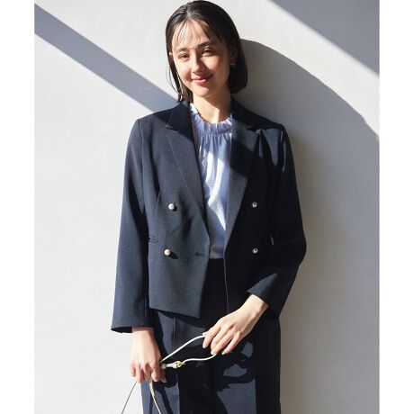 ■デザインクロップド丈のやや広幅のノッチドラペル、ダブルブレストのジャケットはボリュームのあるボトムにも合わせやすく大きめのパール釦がアクセント。華やかなシーンから普段使いまで可能な汎用性が高いへビロテ間違いなしのジャケットです。ウエスト部分が程よくフィットした誰でも素敵にみえるシルエットにこだわりました。裏なしの仕様なので着用期間が長いのも魅力的です。袖口にあるスリットにより折り返していただくとさらに抜け感のある着こなしが叶います。
