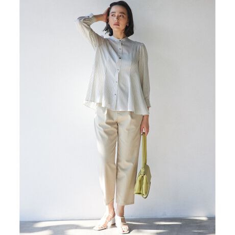 ■素材コットンのなめらかさと麻の清涼感をあわせ持つナチュラルでありながら綺麗な素材です。チノのようなナチュラルな見え感でありながら、柔らかくサラリとした風合いと手触りの良さが特徴です。※麻が少し入っているのでナチュラルな麻のフシが入っています。