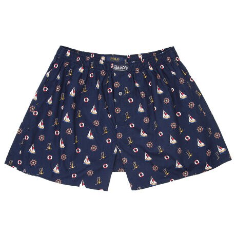 オーガニックコットン100%の平織生地を使用したトランクスです。表面のなめらかさと光沢のある素材感が特長。フロントセンターに縫い付けたラベルがポイントで、ロゴ刻印入りボタンがさり気ないこだわりです。ネイビーベースにマリンモチーフの柄をオールオーバープリントした、ギフトにも最適なアイテムです。前開き仕様。