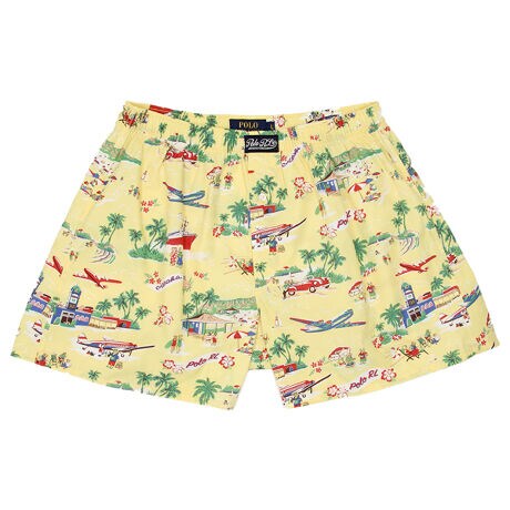 オーガニックコットン100%の平織生地を使用したトランクスです。表面のなめらかさと光沢のある素材感が特長。フロントセンターに縫い付けたラベルがポイントで、ロゴ刻印入りボタンがさり気ないこだわりです。イエローベースに休暇を楽しむ様々なPOLOベアをオールオーバープリントした、ギフトにも最適なアイテムです。前開き仕様。