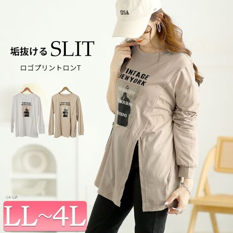 【大きいサイズ】 斜めスリットロゴプリントロンT 大きいサイズ レディース トップス カットソー 春