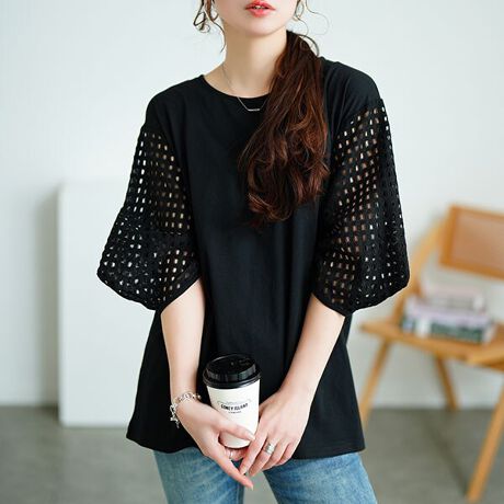 異素材使いが今っぽさ漂うメッシュスリーブ7分袖カットソー。ワントーンのシンプルさが着こなしやすいカットソーに、シアー感のあるメッシュ地をドッキングすることで、軽快な爽やかさを演出します。ボリューム感のある変形スリーブが、レディなひと匙を加えるカットソーです。程よくゆとりのあるラウンドネックで、お顔周りをすっきり見せ。ボリューム感のあるスリーブだから二の腕をカバーし、7分袖で手首を華奢見えに♪長過ぎないすっきり丈で、さり気なくヒップラインを隠しつつ、上半身を体型カバー。シンプルだから着こなしやすく、コーデに取り入れやすい一枚。