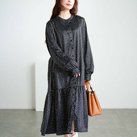 甘すぎない大人のモノトーン柄で着映えるティアードワンピース。ふわっと体を包み込む華やかなシルエットで、一枚着るだけで女性らしさ溢れる柔らかな雰囲気を演出してくれます。デイリー使いはもちろん、デートや女子会でも好印象間違いなしの一着です♪裾までボタンが開閉可能な前開き仕様なので羽織としても着用していただけるのでこの一着でカジュアル〜フェミニンまで様々なスタイルを楽しんでいただけます◎