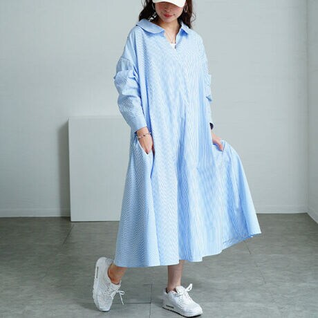 クリーンな大人可愛い印象惹き立つ、後ろレースアップストライプシャツワンピースの登場です☆裾にかけてひらりと広がるAラインシルエットでお腹〜脚まで気になる部分をまるごとカバー◎胸元タックでお胸が大きめの方でも窮屈感なくゆったりとご着用いただけます。一見クリーンな綺麗めワンピースに見せかけて、後ろ姿に大人可愛い編み上げデザインをプラス♪デイリー〜オフィスまで多様なシーンで着回していただける一着です◎