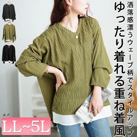 【大きいサイズ】 ウェーブプリーツフェイクレイヤードプルオーバー 大きいサイズ レディース トップス