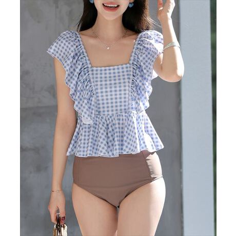 肩から胸下までのたっぷりフリルで肩回りを華奢見せ。