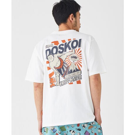 四股を踏んでいるおすもうちゃんとロゴデザインを、ポスターのようなイメージでバックプリントにて表現しました。