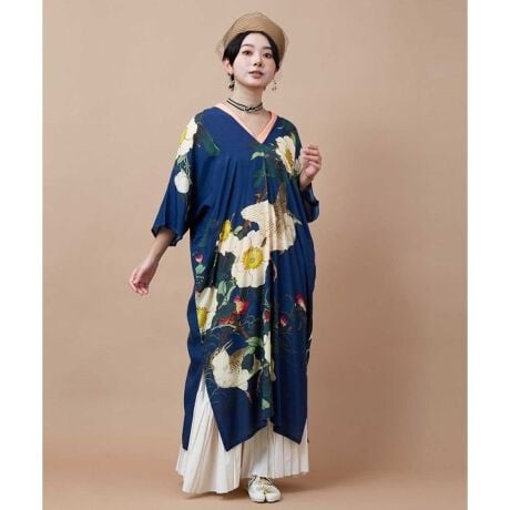 [型番:7IA-5110-2025]大胆な花鳥画が目を惹く薄手のワンピース。江戸から明治にかけて活躍した日本画家・幸野楳嶺(こうのばいれい)の「楳嶺花鳥画譜(ばいれいかちょうがふ)」をもとにしたプリントが華やかです。レーヨン素材で涼しく快適な着心地。首まわりが広くゆったりとした形で体型を気にせず着られ、両サイドにポケットも付いています。
