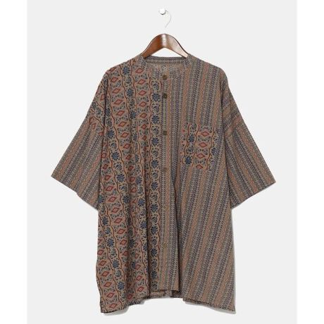[型番:IAC-5146-2025]インド更紗をモチーフにした花柄×ストライプ柄のメンズシャツ。涼し気な薄手の綿素材で軽い着心地のアイテム。