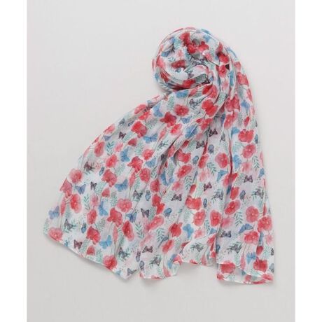 [型番:7CJP5101-2025]優しい色合いで描いた花と蝶柄のストール。ふんわりとした柔らかな手触り。水彩画のようなタッチが可愛らしい印象を与えてくれます。