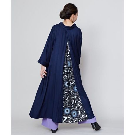 [型番:7IA-5116-2025]歩いた時にちらりと見える八掛(はっかけ)のワンピース。まるで着物の重ねのような衿は、一枚着るだけで和の装いに。レーヨン素材で柔らかな着心地。八掛の柄は日本の染色道具である型紙をイメージした花柄。