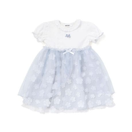 ホワイトに重ねたブルーのチュールがさわやかなブルーと配色の袖がガーリーさをプラスする女の子らしいピンクの2色展開です。