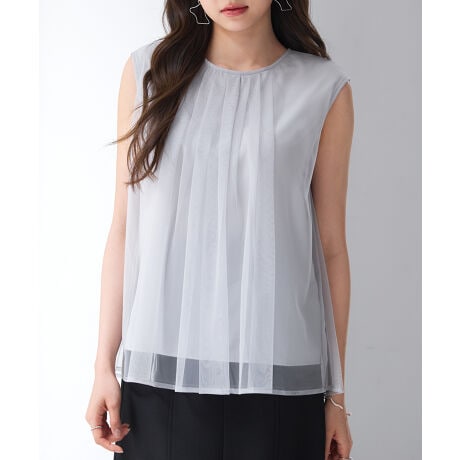 プリーツデザインが施されたきれいめのチュールノースリーブブラウス。