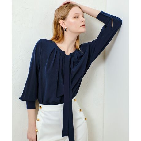 ボウデザインとギャザーを入れたネックデザインが、華やかでフェミニンな印象を与えます。